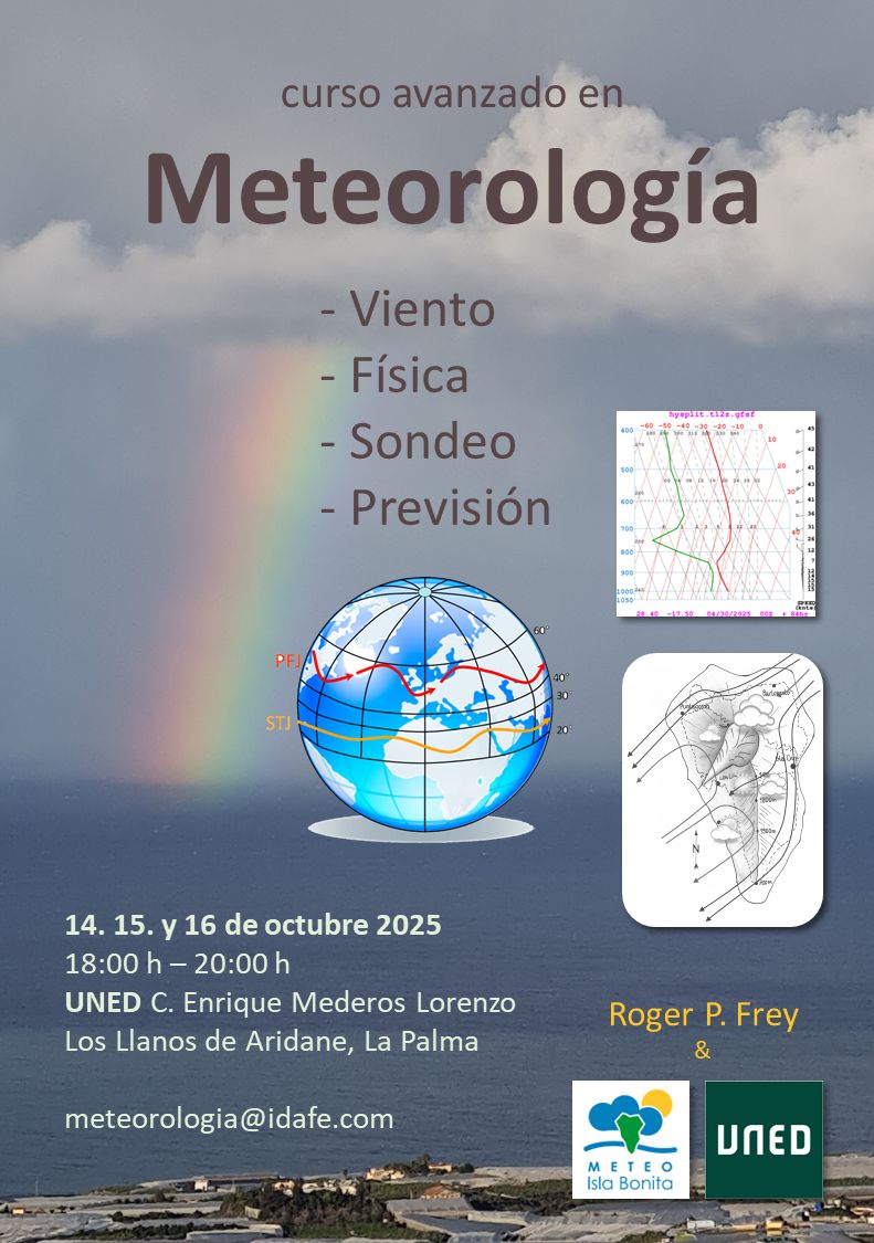 So heisst unser Wetterclub hier auf La Palma. Wir sind Wetterbegeisterte die sich intensiv austauschen. Auch haben wir uns zum Ziel gesetzt, die Einzigartigkeit von La Palma, die auf kleinstem Raum vielfältigste Wettererscheinungen produziert, hervor zu heben. Wir haben deshalb ein Wetterbüchlein über die Insel publiziert, sind in sozialen Medien präsent und geben auch Kurse. In diesem Jahr sogar zwei, bei der UNED der Universidad Nacional de Educación a Distancia, die ausserordentlich schnell ausgebucht waren. Das lokale Interesse mehr über das Wetter auf La Palma zu erfahren ist offensichtlich.