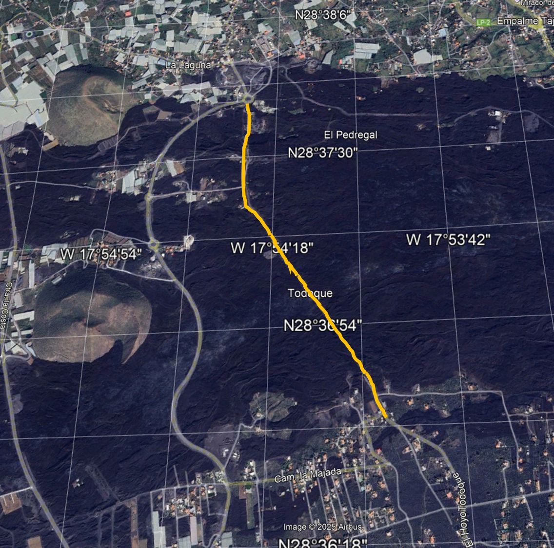 Los verdaderos hitos ya no son tan frecuentes. Sin embargo, hoy se produce uno que pasará a la historia.Justo a tiempo para la procesión de la Virgen de las Nieves hasta la plaza de la antigua iglesia de Todoque y luego hasta el cementerio de Las Manchas, se ha terminado la carretera que va desde la nueva rotonda hasta Las Manchas a través de la lava. Está asfaltada, pero se ha explicado que el firme es aún provisional. Más adelante, la carretera se ampliará para cumplir con las normas europeas. Discurre exactamente por la antigua calzada, por lo que hasta ahora no ha sido necesario llevar a cabo expropiaciones.