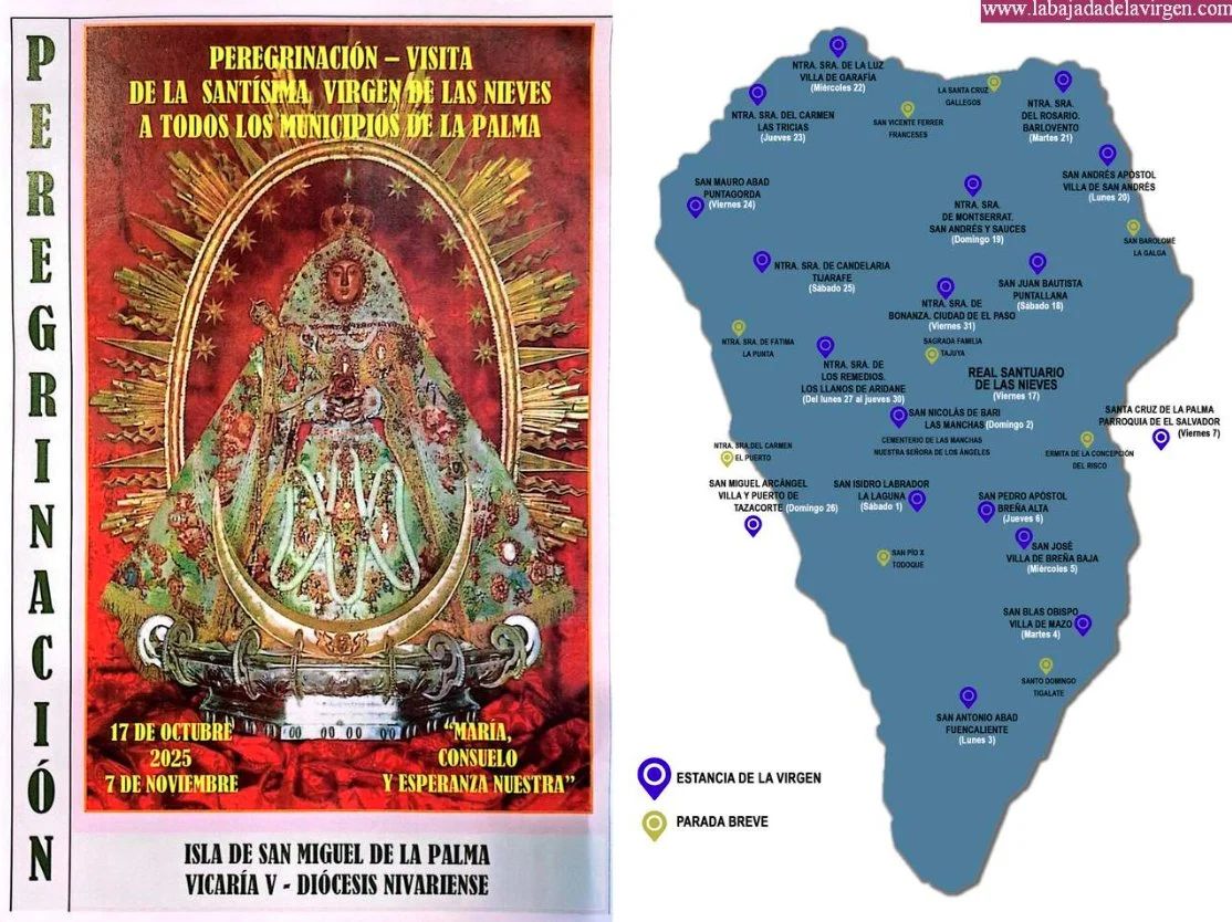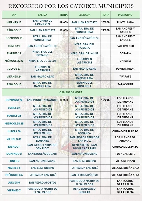 El viaje continuará el sábado 1 de noviembre hasta el cementerio de Las Manchas, pasando por Fuencaliente y Breña, para llegar de nuevo a Santa Cruz de La Palma el 6 de noviembre. El viernes 7 de noviembre se espera que la Virgen vuelva a su iglesia habitual.