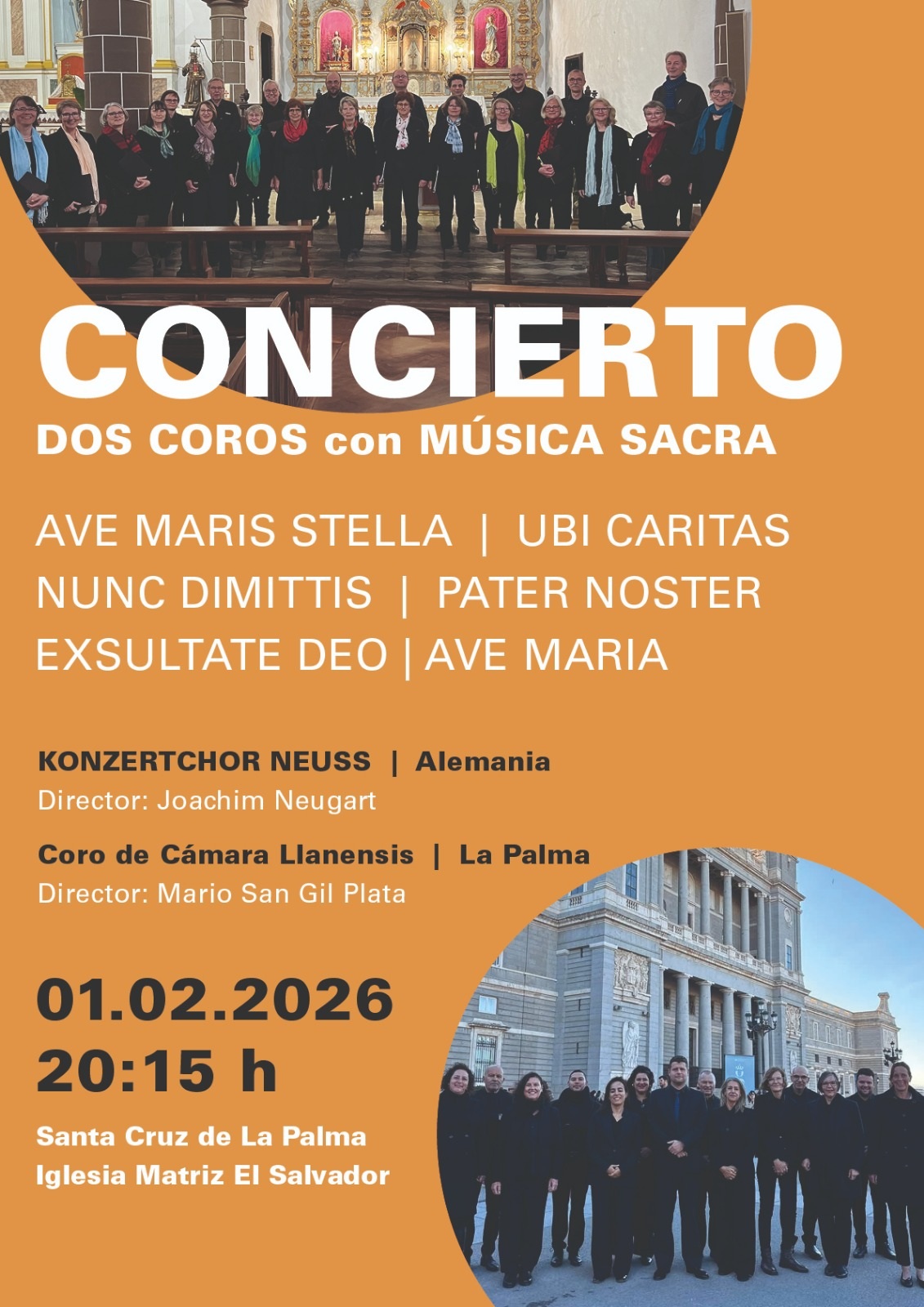El coro Konzertchor Neuss vuelve a visitar la isla y ofrecerá dos conciertos junto con la Cámara Llanesis. El primero tendrá lugar el próximo 1 de febrero a las 20:15 h en la Iglesia Matriz El Salvador de Santa Cruz y el segundo al día siguiente, 2 de febrero, a las 20:00 h en la Iglesia de Nuestra Señora Bonanza de El Paso.