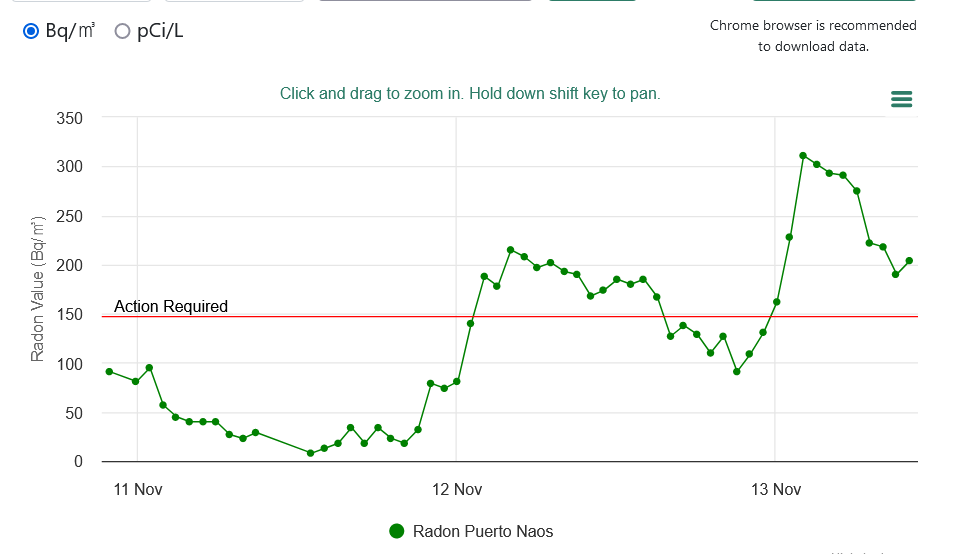 Das Messgerät in Puerto Naos ist nun bereits drei Wochen im Einsatz. Der durchschnittliche Wert liegt bei 176 Bq/m³ und der Europäische Grenzwert von 300 Bq/m³ wurde dabei nur dreimal leicht überschritten, wobei der Höchste Wert bei 345 Bq/m³ lag.