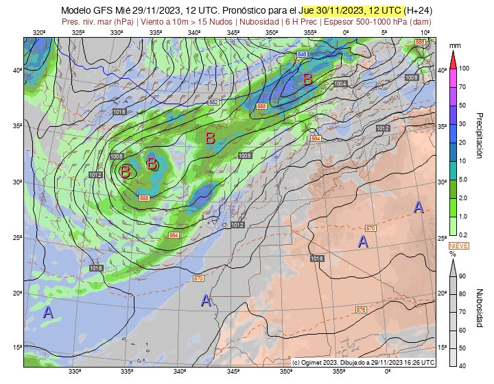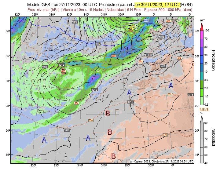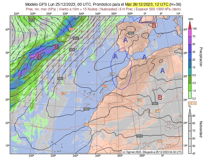 Das ist nun vorbei und die Temperaturen steigen kontinuierlich bis Sylvester auf rund 5°C über dem langjährigen Durchschnitt an. Dabei bleibt das Hoch fast stationär über der Iberischen Halbinsel und verhindert so, dass die vielen Tiefdruckgebiete, die sich im Moment im Atlantik befinden, die Kanaren erreichen können. Der Saharasand indessen schon. Es kommt wieder Calima auf.