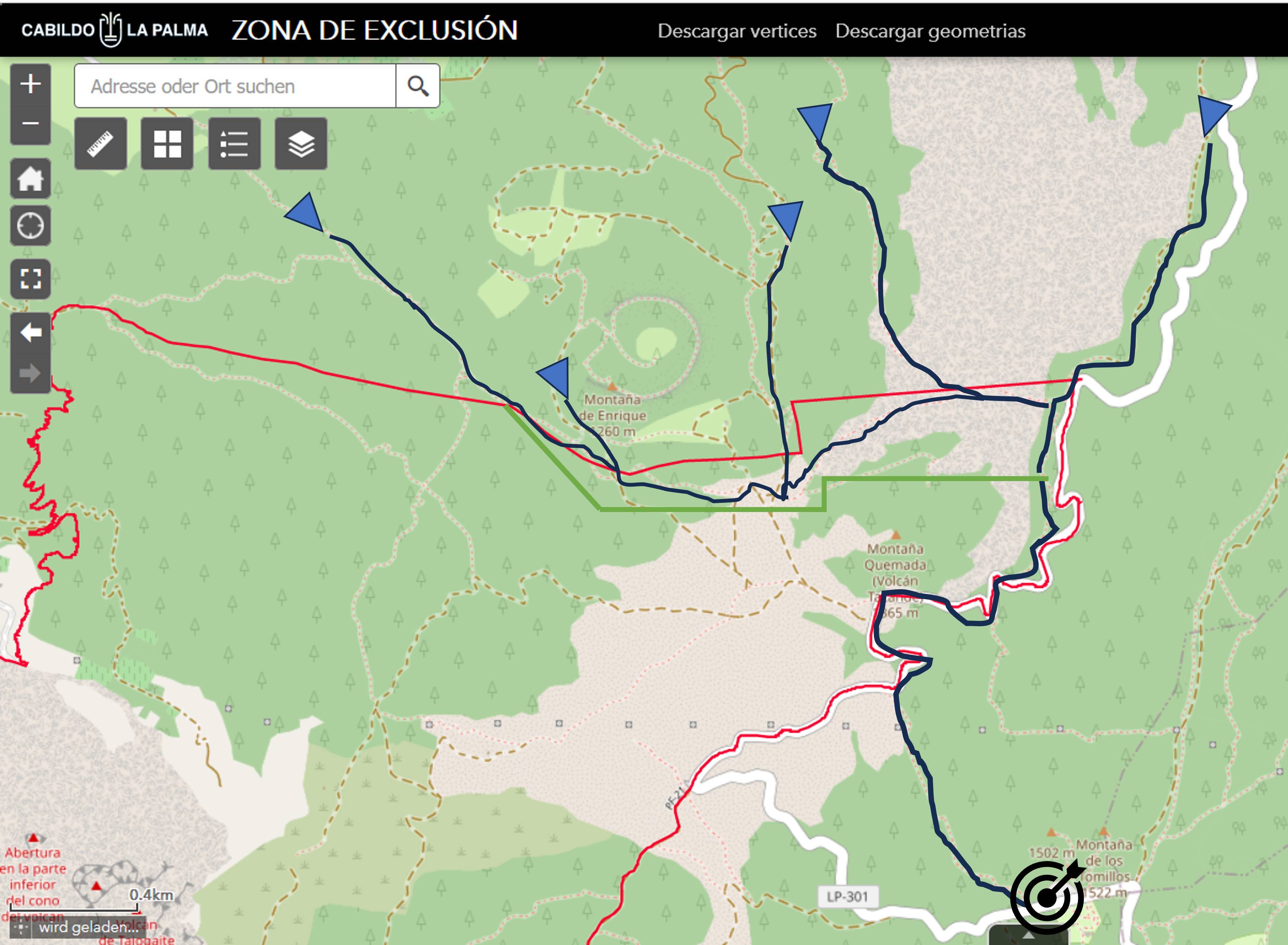 Die Montaña Quemada ist nun definitiv aus der Zone genommen worden. Das ist sehr erfreulich, eröffnet es doch endlich die Wanderwege von El Paso hoch bis zum Refugio El Pilar. Weiterhin vermisse ich die Feinarbeit. Man at sich leider auch bei dieser Edition nicht die Mühe genommen, die Zone wenigstens überall den Wanderwegen entlang zu legen und so bleibt es in einigen Teilen viel zu komplex für den unkundigen Touristen. So zum Beispiel südlich der Montaña Enrique wo man den Wanderweg 20 bis 50m in der Sperrzone lässt und der Wanderer die Schilder schlichtweg suchen muss.