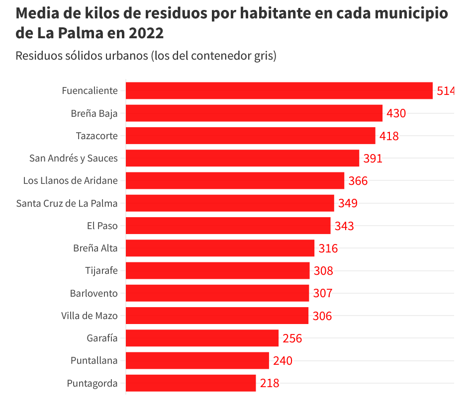 Die Unterschiede im generieren von Abfall sind auf La Palma bemerkenswert. So produziert Fuencaliente pro Kopf mit 514 kg mehr als doppelt soviel Abfall in der grauen Tonne als Puntagorda mit nur" 218 kg.