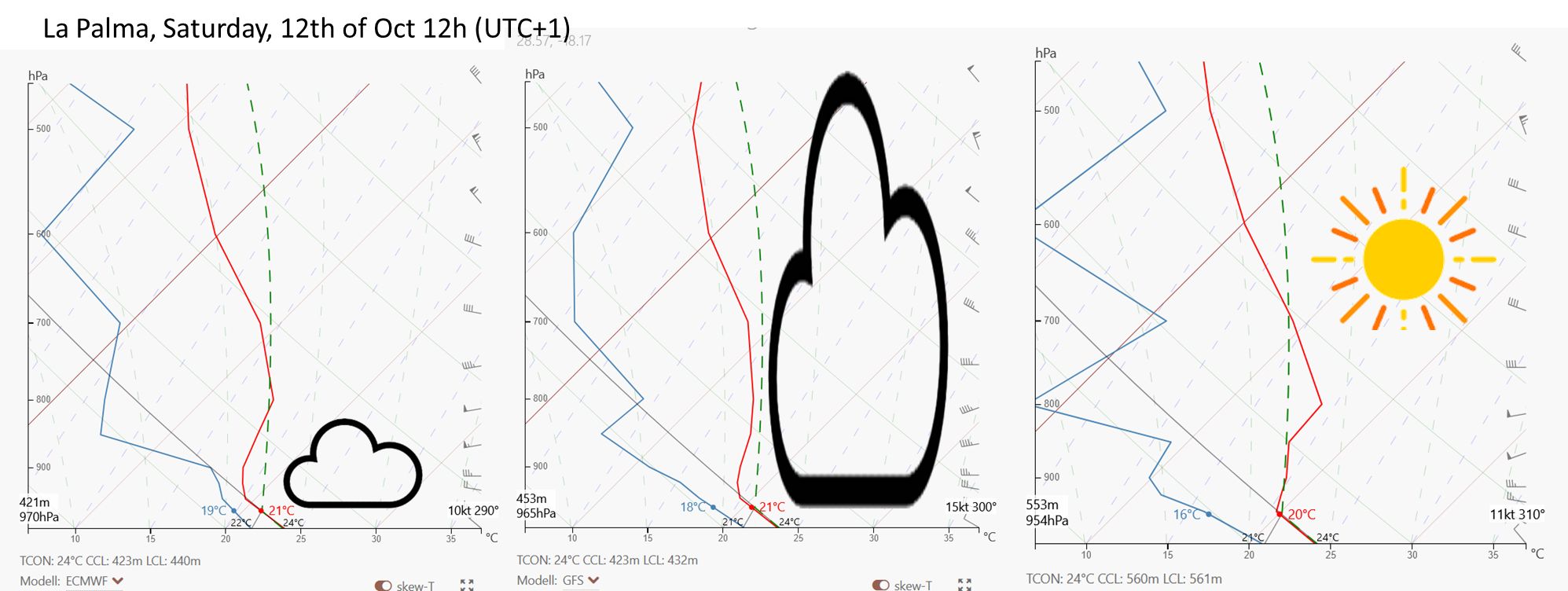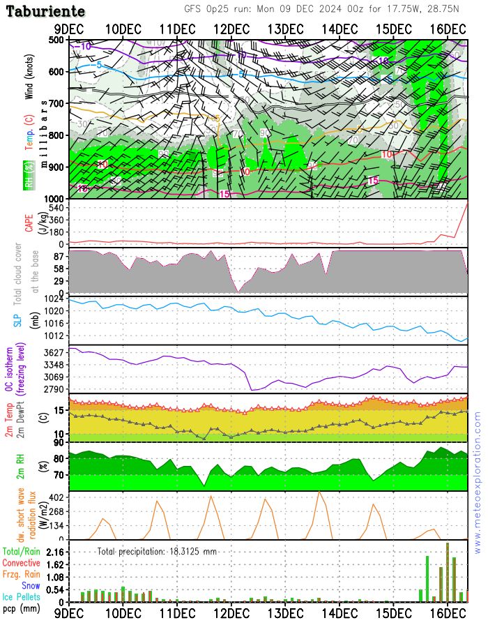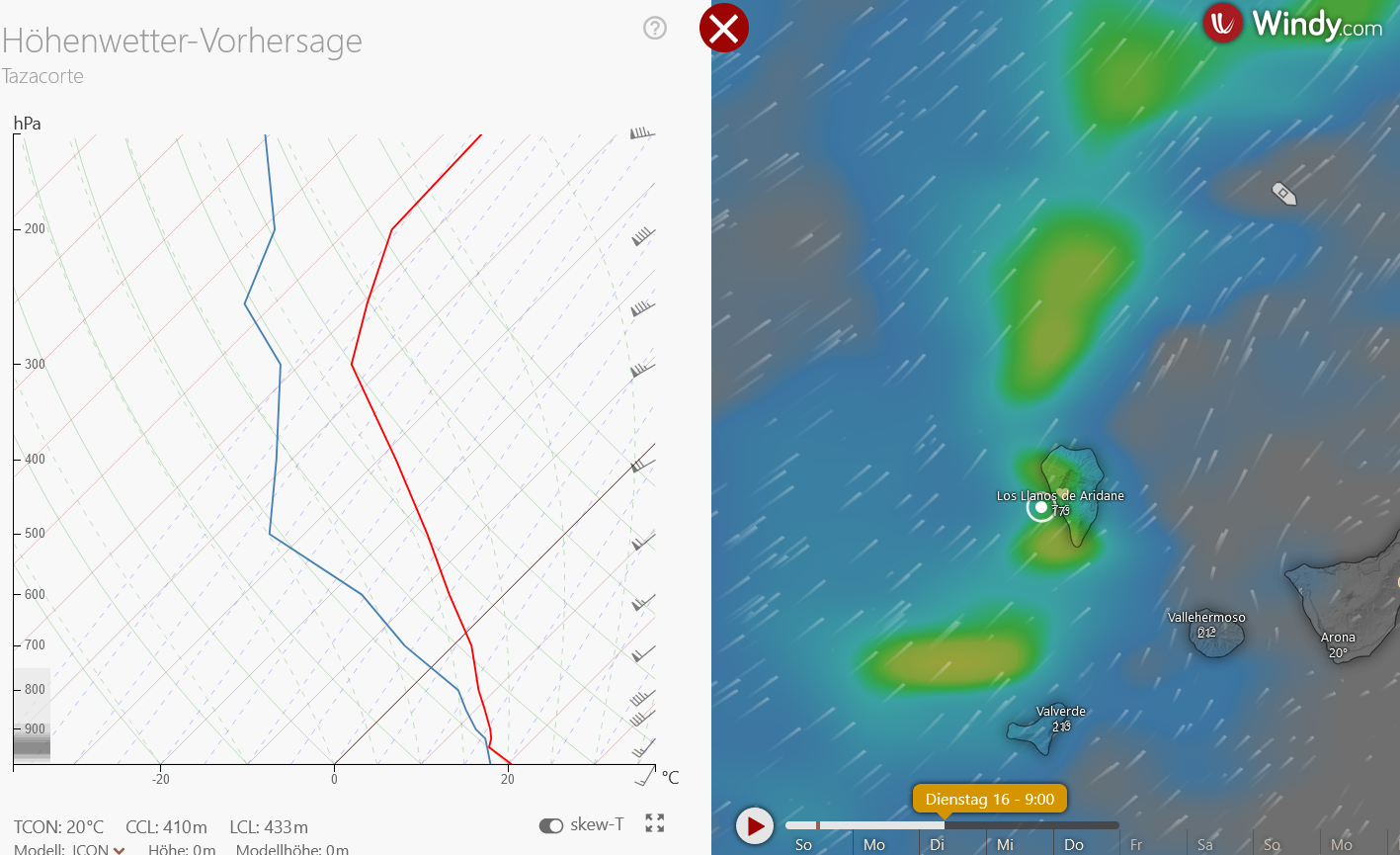 Für Wetterspezialisten: Es wird etwas stabilere Luft zu uns geführt, die Sondierungsprognosen zeigen eine Isothermie von 0 m bis ca. 600m AMSL. Das wird den Fallwind zuerst bremsen, aber nach meiner Erfahrung mischen bereits 25 knoten diese Stabilität im Lee weg und die Wettermodelle melden für die Südspitze der Insel in der Nacht auf Montag bis zu 50 kn. Das entspricht 90 km/h und Böen können problemlos deutlich stärker werden...