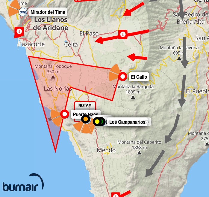 Morgen beginnt im Tagesverlauf eine zunehmende Südostströmung. Südostwind ist unberechenbar und kann ohne Vorwarnung jederzeit mit starken Böen in El Remo / Puerto Naos zum Meer herunter fallen. Es ist bei Südostwind möglich, dass man auch in den Bergen am Campanarios einen leichten Aufwind bemerkt und auch in Puerto Naos normale Windverhältnisse vorherrschen. Auch das Meer zeigt nicht korrekt an, was passiert und wie aus dem Nichts fliegen in Puerto Naos plötzlich die Strandstühle und die Sonnenschirme weg. Auch ist es möglich, dass die Böen Puerto Naos nicht erreichen, aber der Flug bis nach Puerto Naos ist plötzlich äusserst turbulent.