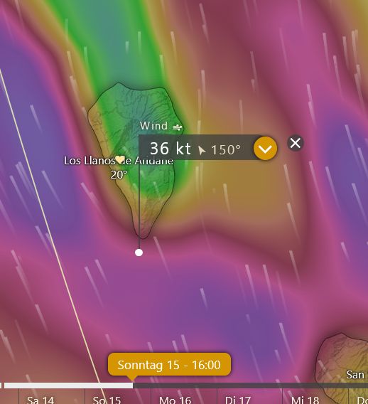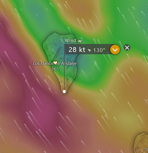 Die Situation mit Südostwind hält bis am Samstag an. Verschiebt sich die Windrichtung nur ein paar Grad nach Ost, kommt La Palma in das Lee von Teneriffa und es passiert gar nichts, dreht die Windrichtung aber ein paar Grad nach Süd, beginnt die Gefahr neu.