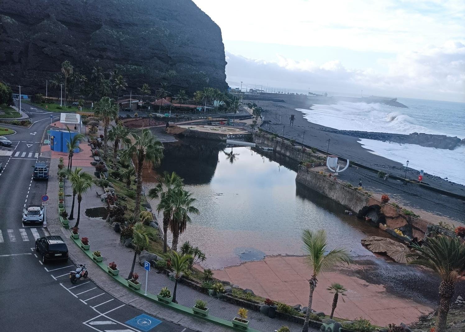 Einmal mehr schafften es die Regenzellen ein paar Kilometer nördlich von uns durch zu ziehen. Es gab kaum nennenswerte Niederschläge, in Tacande 1,8 l/m². Das Tief hat aber das Meer ganz gehörig aufgemischt. In Tazacorte ist es einmal mehr über die Promenade gelangt und hat im Meeresschwimmbecken, das nie eröffnet wurde, etwas Wasser und auf der Promenade Sand hinterlassen.