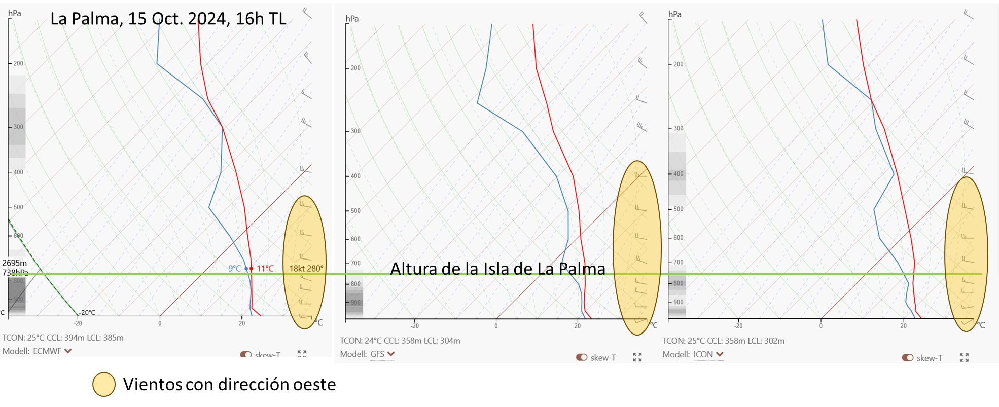 Die Prognosen sind schwer, einige Wettermodelle rechnen den Staueffekt der kleinen aber hohen Insel La Palma nicht wirklich und so gehen die Meinungen der Modelle über Regen morgen wieder deutlich auseinander. Obschon ab 3.000 m deutlich trockenere Luft zu uns geführt wird und das was morgen ankommt in keiner Art und Weise einer Front entspricht, so scheinen Feuchtigkeit, Windstärke und Windrichtung auszureichen um auf der Westseite speziell in und um El Paso morgen Freitagnachmittag Regen zu produzieren.
