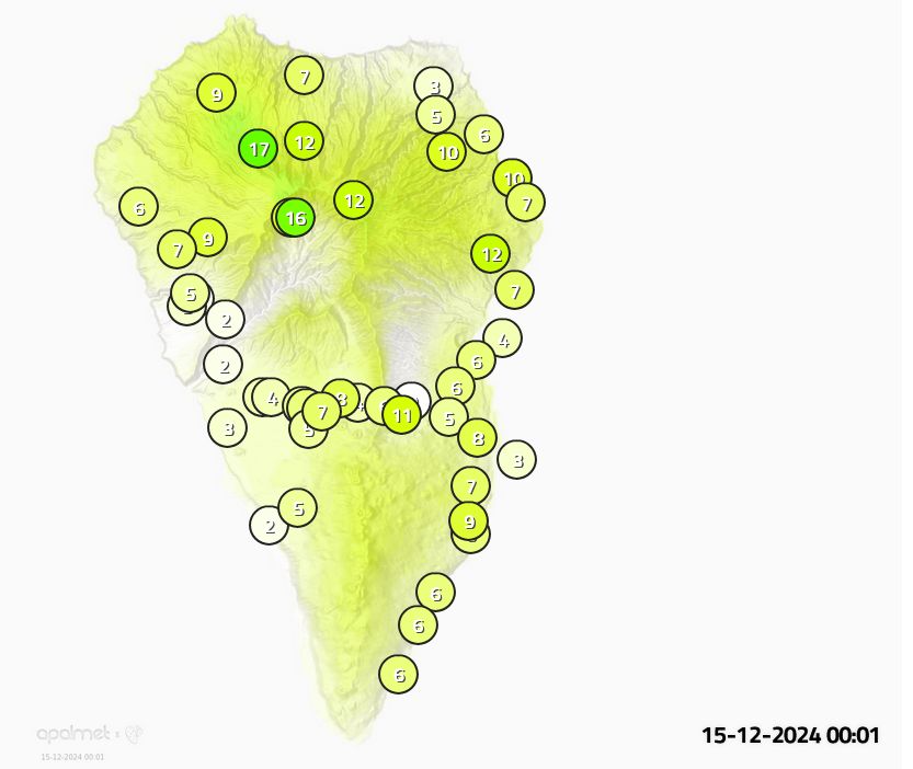 Der Regen dieser Episode ist nun mehrheitlich gefallen. Wie vorausgesagt eher wenig, dafür auf der ganzen Insel. Die Windrichtung in der kritischen Höhe für Fallwinde in Richtung Ost hat sich auf Nord geändert. Der Osten bleibt somit vom Schlimmsten verschont. Die Windstärke nimmt heute im Tagesverlauf noch zu. Sehr starke Windböen sind auf der Westseite, speziell der Küste von El Remo und Puerto Naos bis nach La Bombilla, aber auch in Las Manchas zu erwarten. Auch über den El Time bis Tijarafe und Puntagorda wird der Sturm heute fegen. Eine zögerliche Verbesserung ist nicht vor Montag Nachmittag in Sicht.