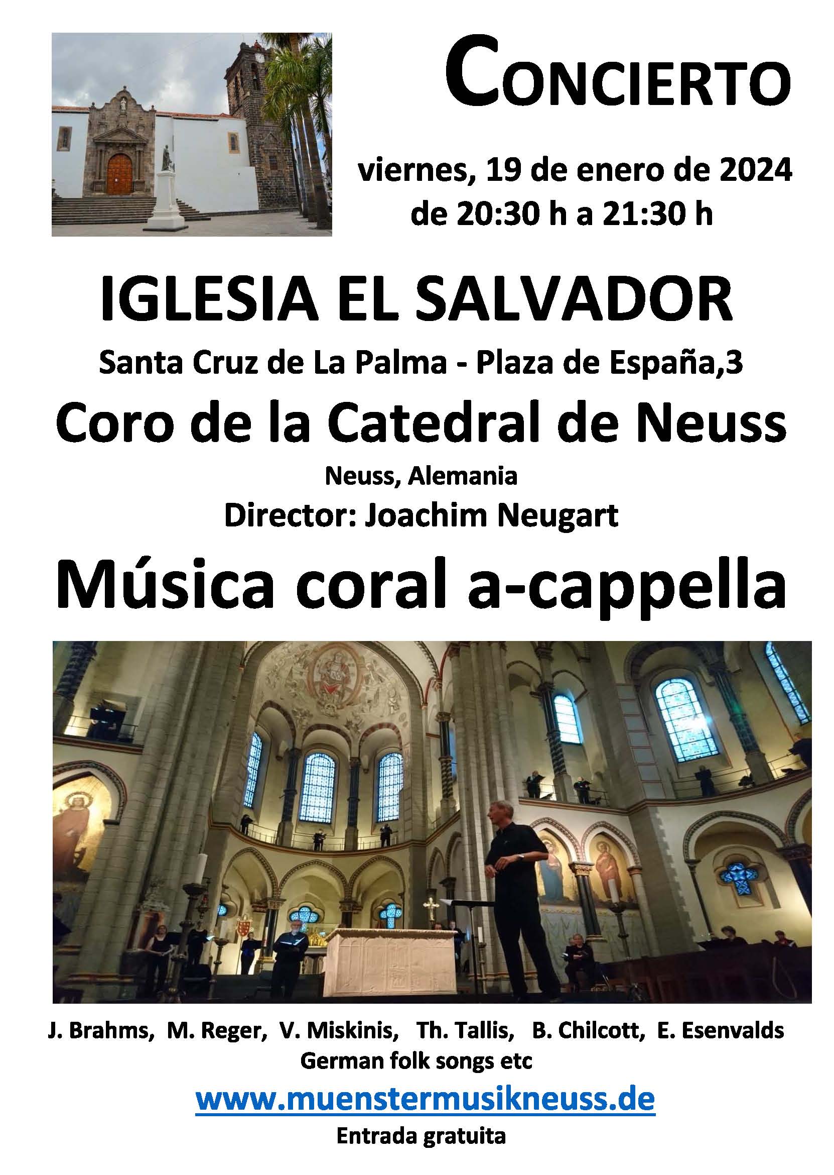 Es freut mich, das obenstehende kostenlose Konzert des Chors der Kathedrale in Neuss, Deutschland, welches am 19. Januar 20:30h in der Kirche an der Plaza España in Sta. Cruz stattfindet, ankündigen zu dürfen.