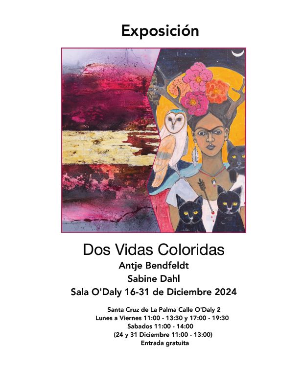 Die beiden Künstlerinnen zeigen eine faszinierende Kollektion von Arbeiten, die die kreative Vielfalt und die einzigartigen unterschiedlichen Formensprachen von ihnen widerspiegeln. Antje Bendfeldt begeistert mit ihren „Fridas“ und deren fast magischen Verbindung mit den Pflanzen und Tieren La Palmas, während Sabine Dahl mit ihren überraschenden Kompositionen und emotionalen Ausdrucksformen beeindruckt.