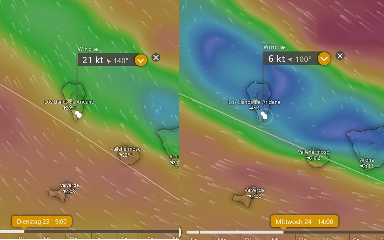 Am Dienstag dreht die Windrichtung auf Südost. Das ist für die Bananenbauern an der Westküste bedrohlich, denn der Südostwind fliesst über die nicht hohe Südspitze der Insel und kann dann als sehr böiger Föhn an der Küste zwischen Las Indias und la Bombilla einfallen. Weil sich die Luftmasse bei SO Wind etwas stabilisiert, das heisst die Temperatur nimmt nur noch um 0,5°C anstelle um 1°C pro 100 m ab, bremst das den Wind, was aber bedeutet, wenn er dieses Hindernis einmal überwinden kann, dass er wie aus dem Nichts auftritt. Ich habe schon einige Male in Puerto Naos wie von Zauberhand Sonnenschirme und Strandstühle wegfliegen sehen.
