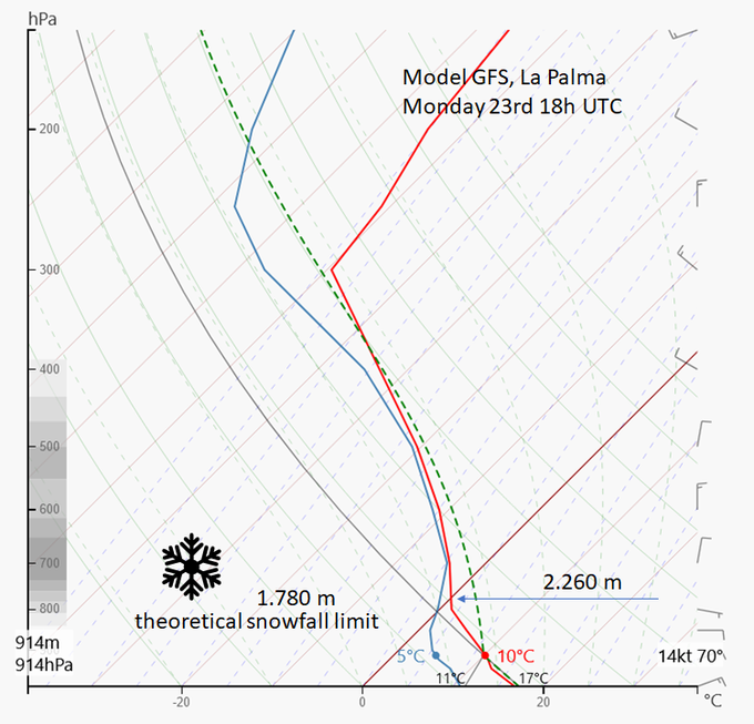 Ein Wettermodell zeigt übrigens an, dass wir am 24.12. morgens, pünktlich zum Winteranfang, etwas Schnee auf dem Muchacho sehen. Die theoretische Schneefallgrenze liegt bei knapp 1.800 m, also deutlich unter dem Roque de los Muchachos mit seinen 2.426m Höhe.
