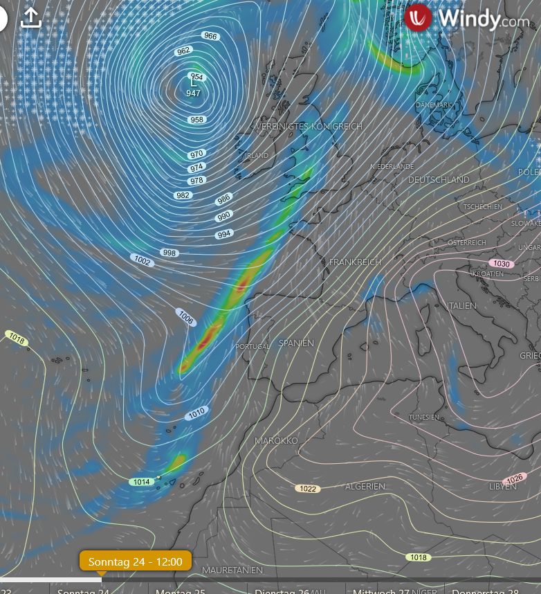Die Wetterprognosen ab Freitag sind noch nicht klar. Nur zwei von drei Wettermodellen sagen die Südwestwindlage voraus. Ein Modell prognostiziert weiterhin Passatwinde. Wenn sich die Modelle im Wochenverlauf einig werden, berichte ich noch einmal.