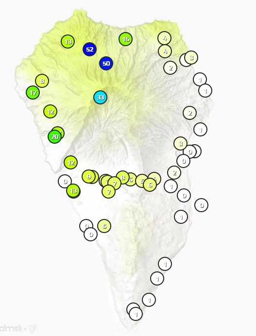 Heute werden mit Passatwinden die bis auf Höhe des Roque de los Muchachos reichen feuchte Luftmassen nach La Palma geführt. Auf der gesamten Ostseite kann es immer wieder regnen. Weil der Passat bis über 2.000m bläst, wird die feuchte Luft auch in den Westen geblasen und führt bergnah auch zu Niederschlägen. Der starke Passat führt im Valle zu Föhn welcher bis zum Meer hinunter blasen kann und sich erst am Mittwoch etwas beruhigen wird. Am Mittwoch dreht die Windrichtung nämlich langsam nach Nord und am Donnerstag nach Nordwest. Sporadischer Regen wird auch am Mittwoch, nun vornehmlich im Norden, auftreten.