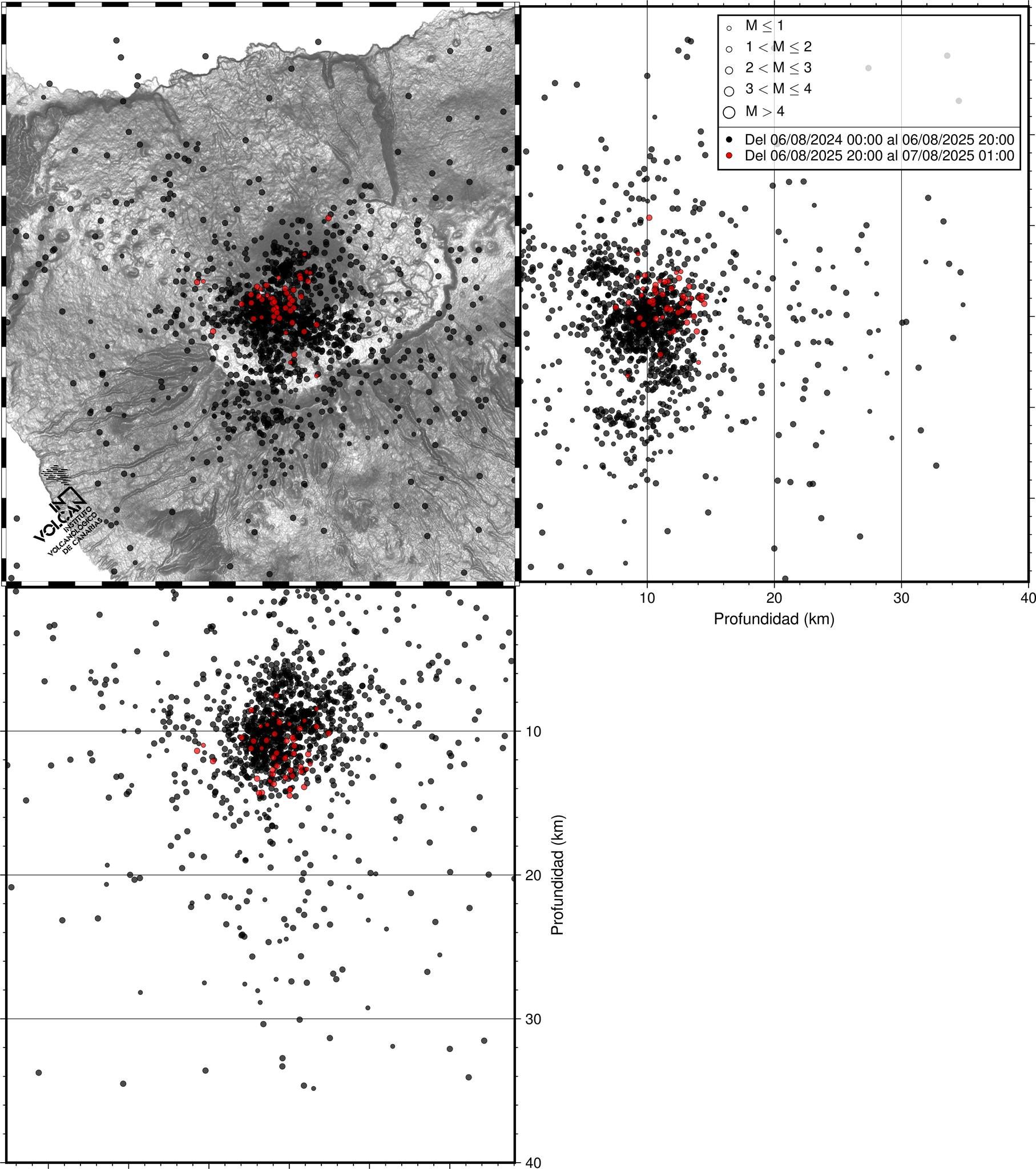 Ayer se produjeron otros dos enjambres sísmicos a 10 kilómetros de profundidad por debajo del Teide. Un enjambre fue causado por terremotos volcánicos/tectónicos, el segundo por terremotos hidrotermales, es decir, terremotos causados por la redistribución de líquidos y gases. Todos estos terremotos fueron de baja magnitud, inferiores a 1,3 mbLg.