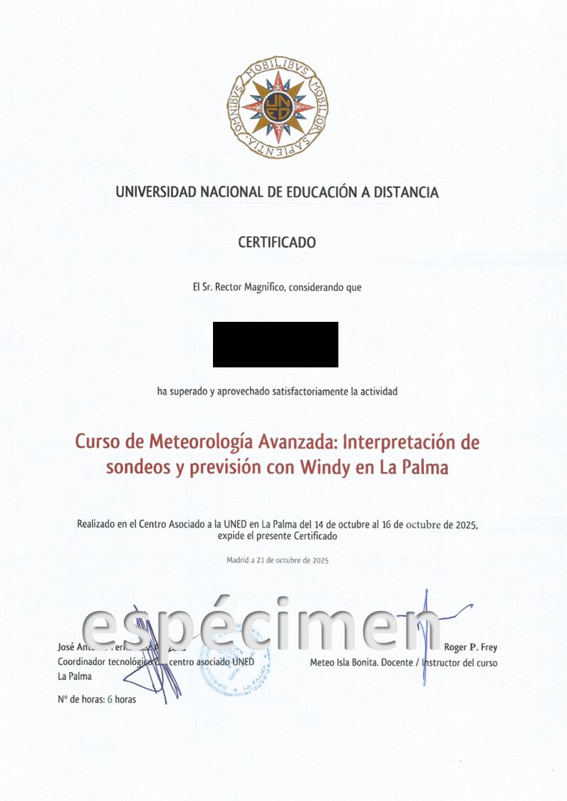 Ya se han expedido los certificados de la UNED para los participantes del curso de meteorología en Los Llanos. El curso otorga 6 créditos universitarios. Los estudiantes pueden recoger los certificados de lunes a viernes, entre las 10:00 y las 13:00 horas, en la sede de la UNED en Los Llanos.